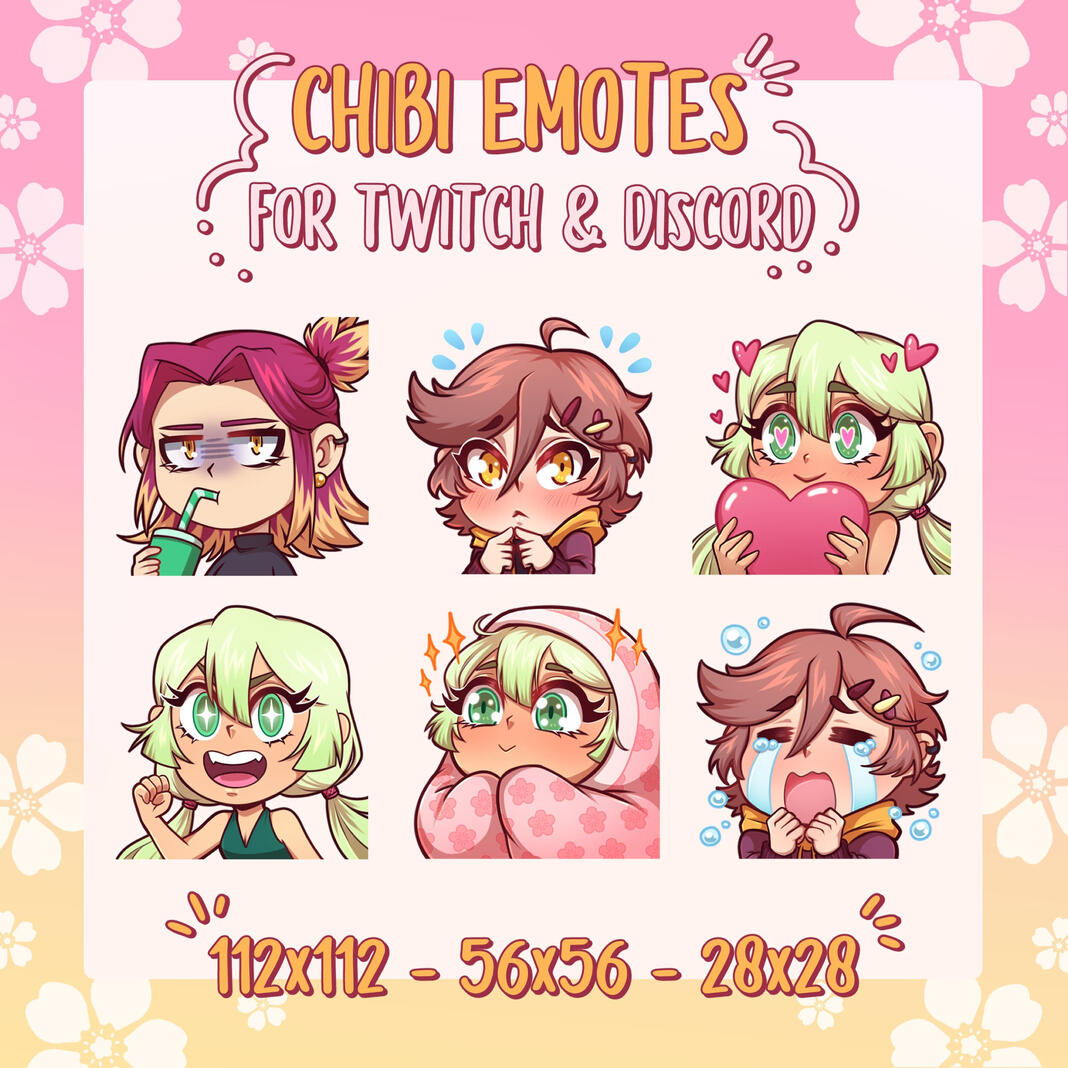 Note that there will be only 1 character per emote.You'll get the emote in the standard Twitch/Discord sizes :112 x 122 px