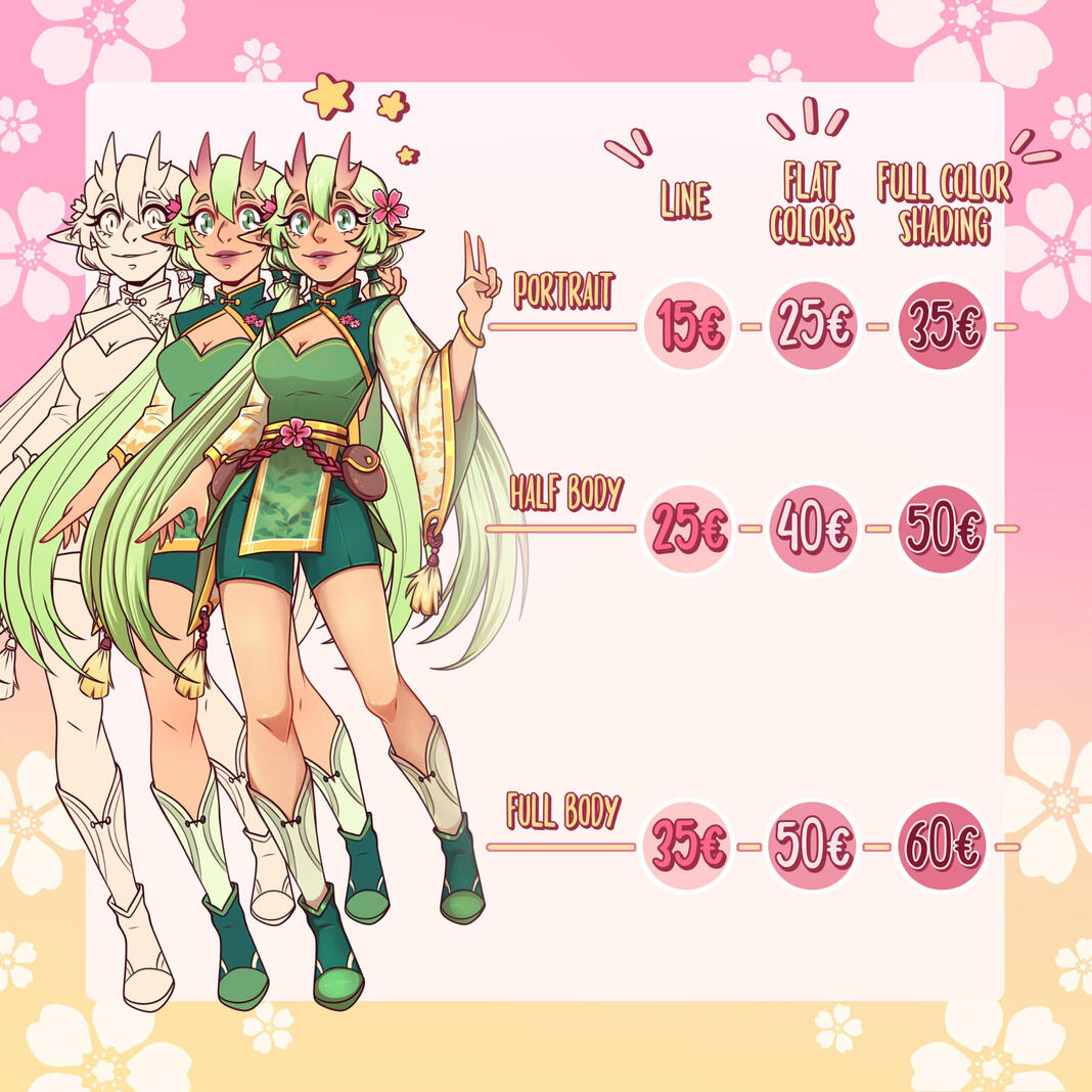 ◆ ICON / PORTRAIT : 15€◆ HALF BODY : 20€◆ FULL BODY : 30€Note that the price may vary deppending if there's additional elements, complexe background, complexe character or extra character.Background price start with 5€
