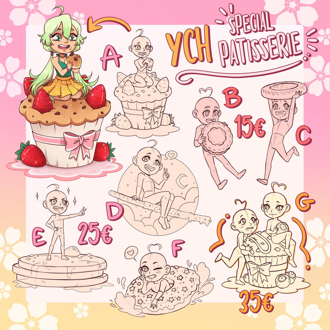 You can chose :The pose of course ( i'll draw the character of your choice )The flavor of the pastry ( chocolate, strawberries etc ...)I can change the eyes and expressions, but not the pose !I can add a color background, you just have to let me know !